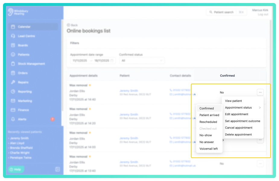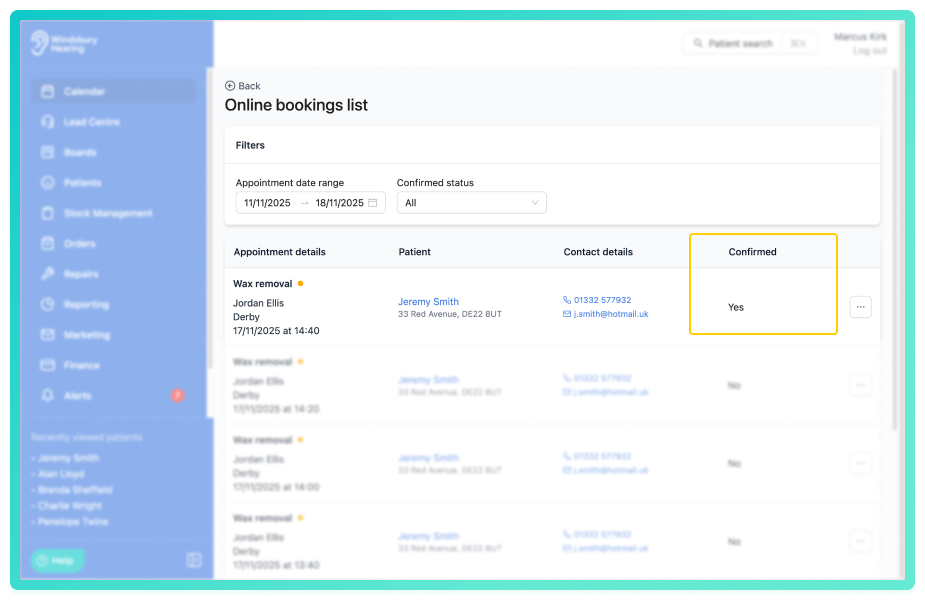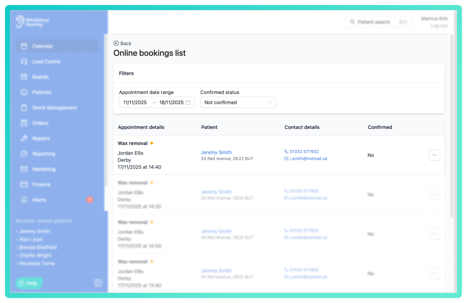 The online bookings list ensures your organisation can effectively mange new appointment requests and keep patient communication prompt and organised. Regularly reviewing and confirming online bookings helps maintain accurate calendar scheduling and a smooth booking experience for patients.