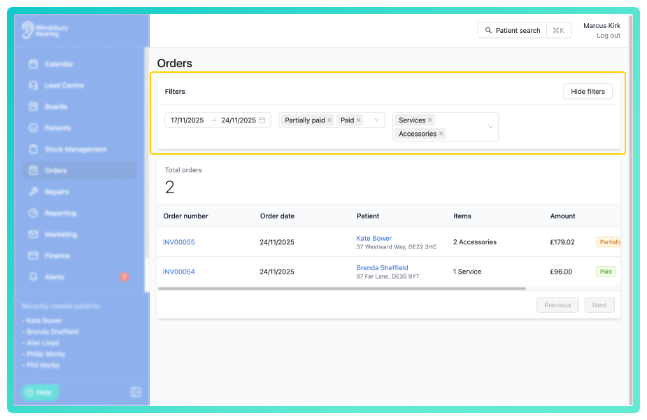 New filters have been added to the order page to narrow down the list by Products (hearing aids, accessories, services, etc) and by the Order status (paid, partially paid, etc).