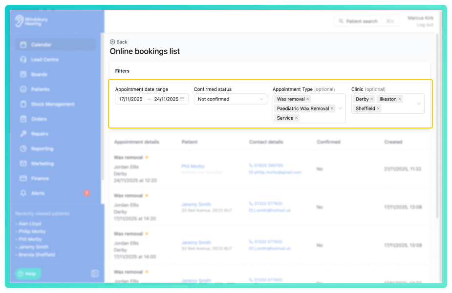 Users can now filter the Online bookings list by up to 3 appointment types and 3 clinics.