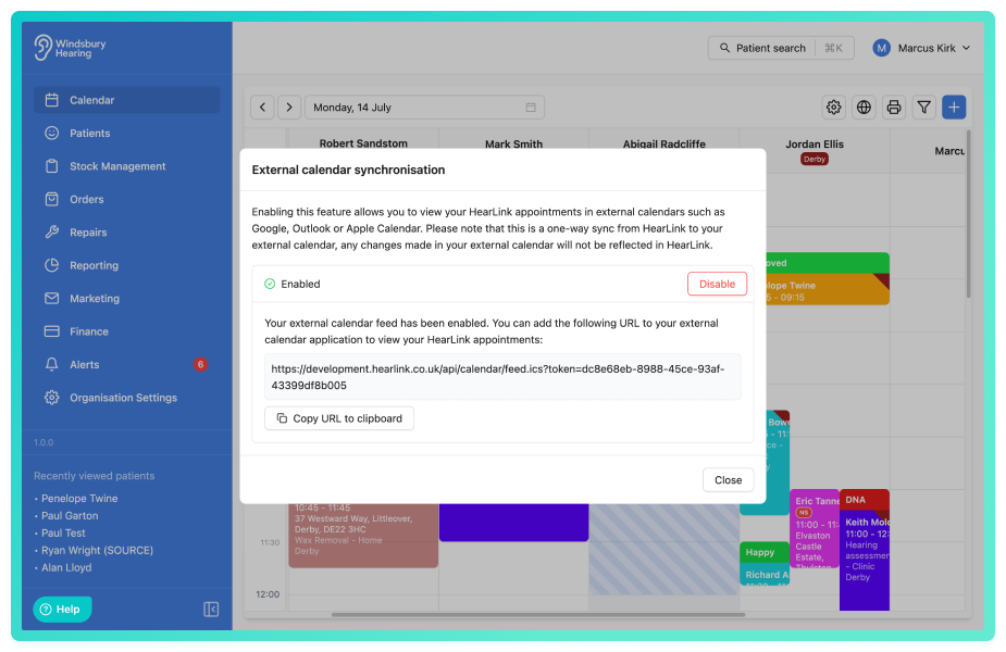HearLink now allows you to connect your HearLink calendar to an external calendar system, such as Outlook, Google Calendar, Apple Calendar, or any calendar that supports iCal feeds.
