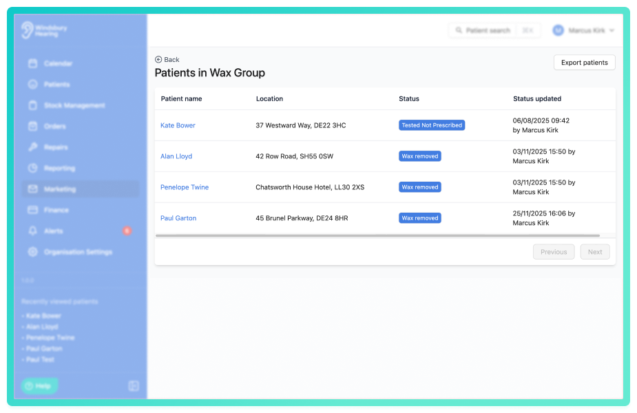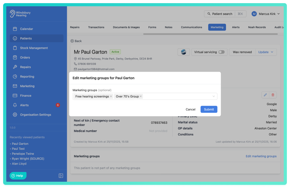 Marketing groups allow your organisation to organise patients into targeted lists for campaigns or follow up activity. These groups can be created, edited and managed directly within HearLink, giving you greater flexibility when planning marketing activity.