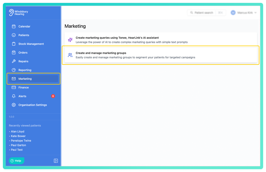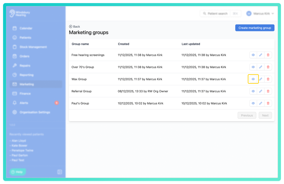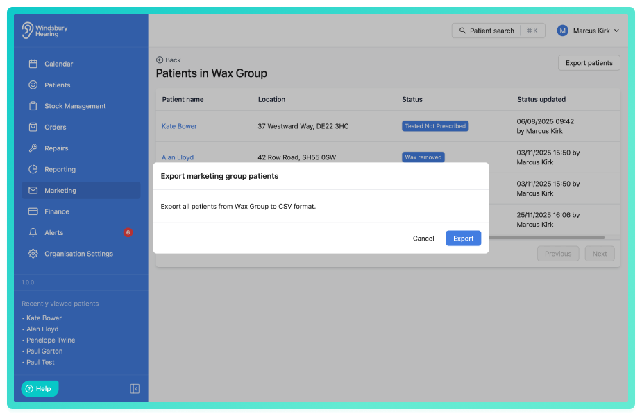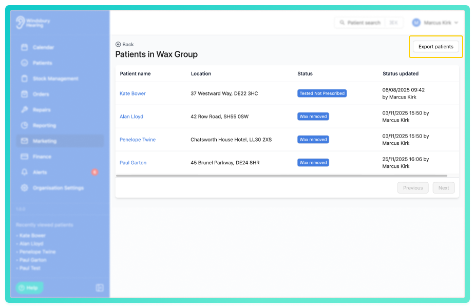 Once marketing groups have been created and patients added to them, your organisation can view the full list of patients within each group and export that data for use in external marketing tools (e.g Mailchimp, HubSport).