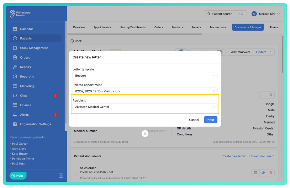 To create letter documents in HearLink you first need to set up letter templates. Once letter templates are set up, you can generate letters directly from a patient profile. Letters are created as PDF's, stored automatically in the patient documents and images sections and can be downloaded, printed or emailed.