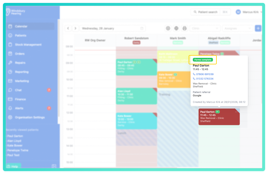 Appointment cards on the calendar now include a visual indicator showing if a patient has completed the forms sent with their appointment confirmation. These are displayed as an icon on the card and as a tag on the popover. This gives staff an instant view of form completion status without the needing to open the patient record, helping clinics prepare in advanced and follow up where required.