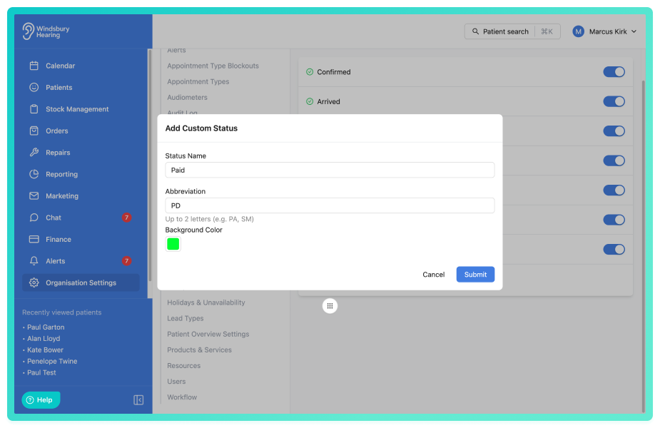 Appointment statuses have been enhanced. Organisations can now control which default statuses are available using new settings in the Calendar section, as well as create custom statuses with their own name, abbreviation and colour. This allows clinics to better align appointment tracking with their internal workflows while keeping calendar indicators clear and consistent.