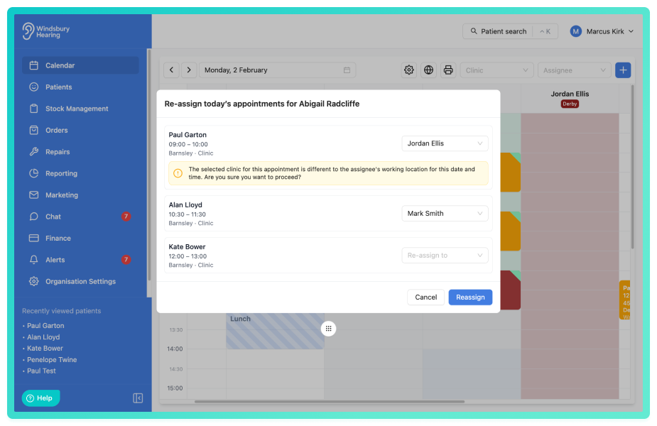 We've added the ability to bulk reassign appointments for a user on any given day. This allows organisation's to quickly move a day's appointments to another or multiple clinicians when covering things such as absences, without needing to edit each appointment individually.