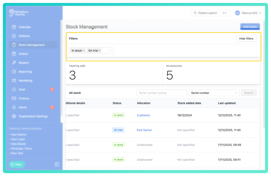 You can now filter the hearing aid stock list by status. This makes it easier to see which devices are, for example, in stock, allocated, on trial and more.