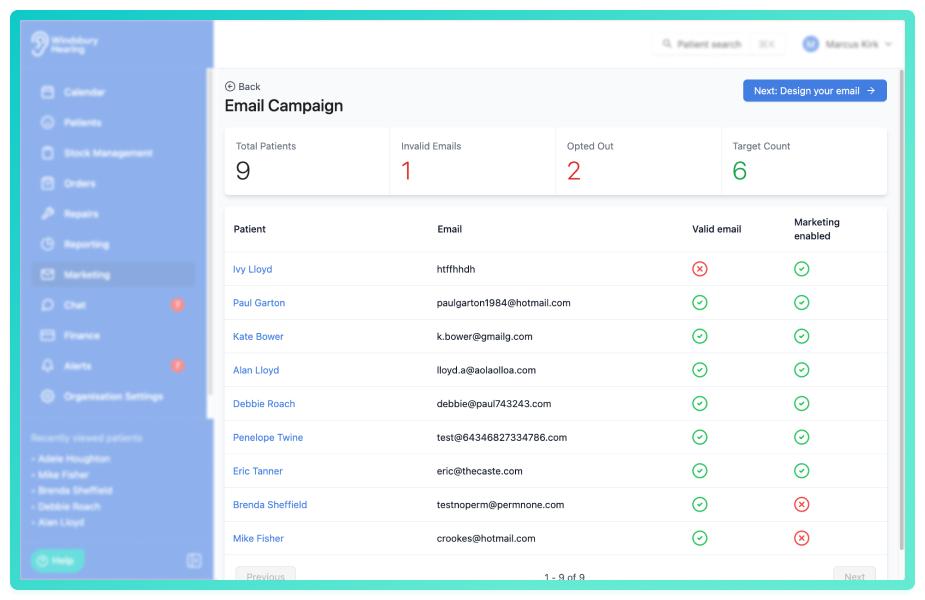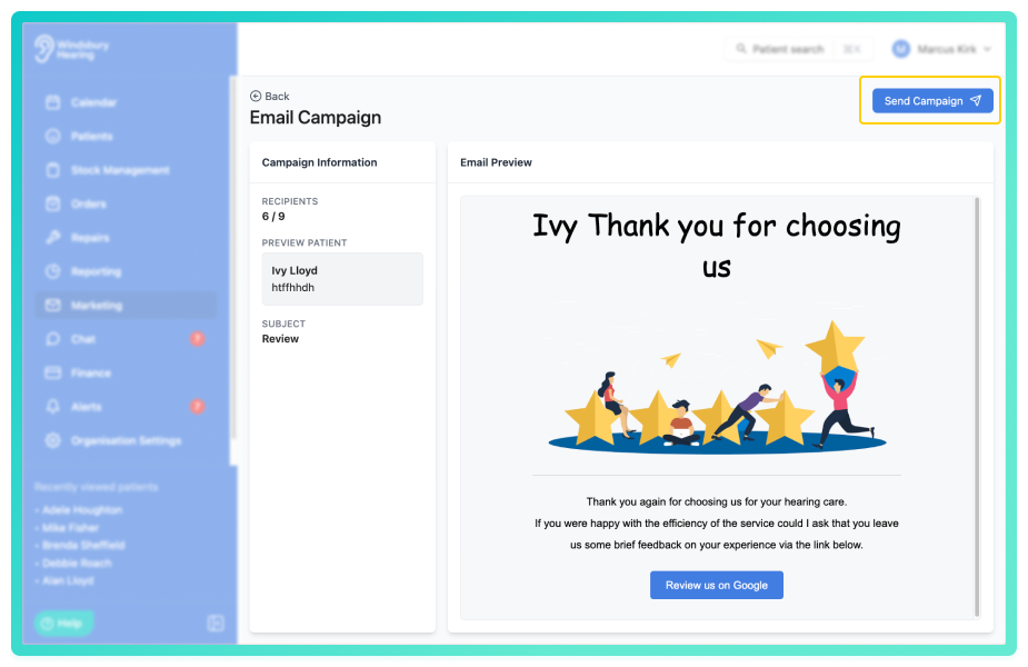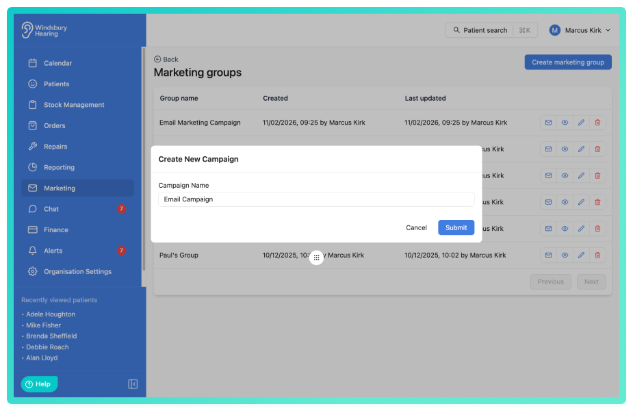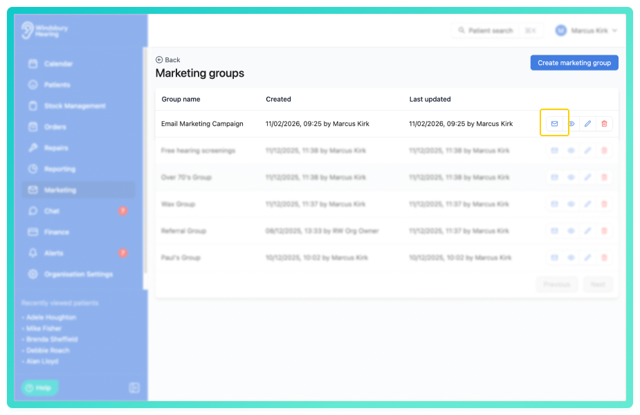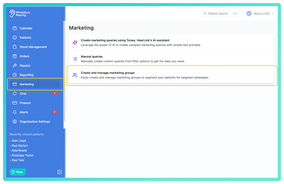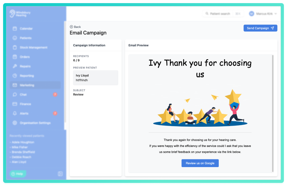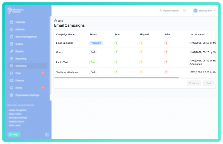 Email marketing campaigns allow you to send targeted email communications to groups of patients directly from within HearLink. Campaigns can be created using Marketing Groups, Manual Queries or queries received by Tonee, helping you build accurate recipient lists based on your organisation's needs.