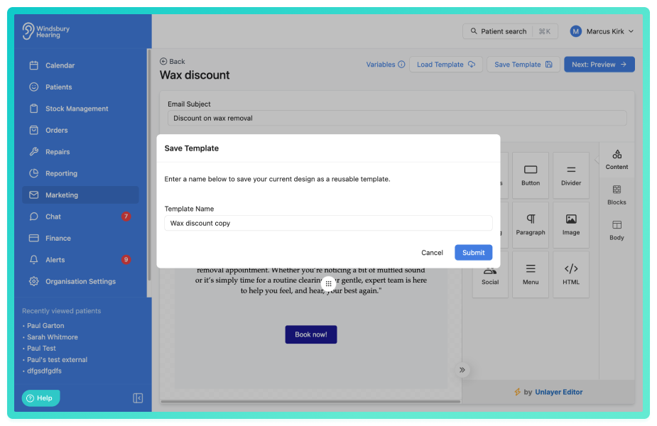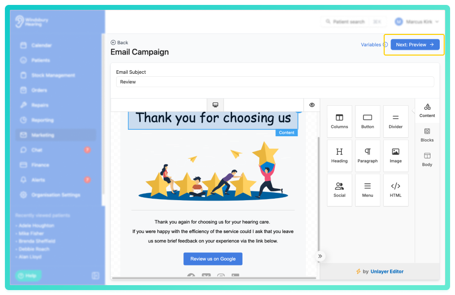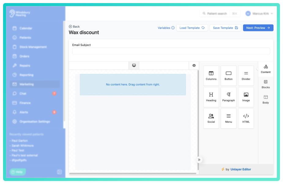 You can create your email directly within HearLink using the available formatting tools. A variety of layouts, styles and variables are available, allowing you to personalise content using patient and organisation data.