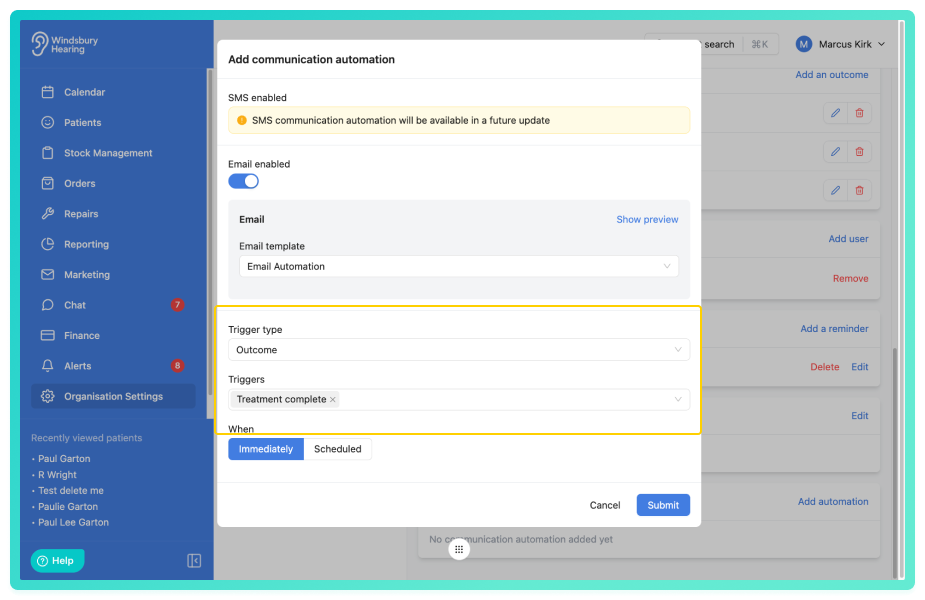 As an example, you may want to send a follow-up email when an appointment outcome is marked as Treatment completed.