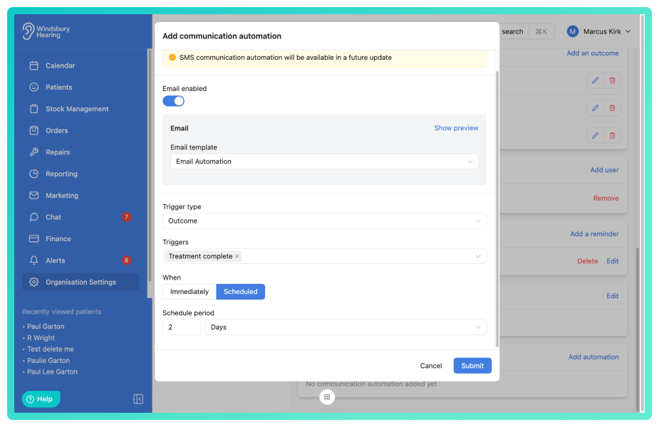 Once saved, the system will automatically send the selected email template two days after the Treatment completed outcome is applied to the appointment.