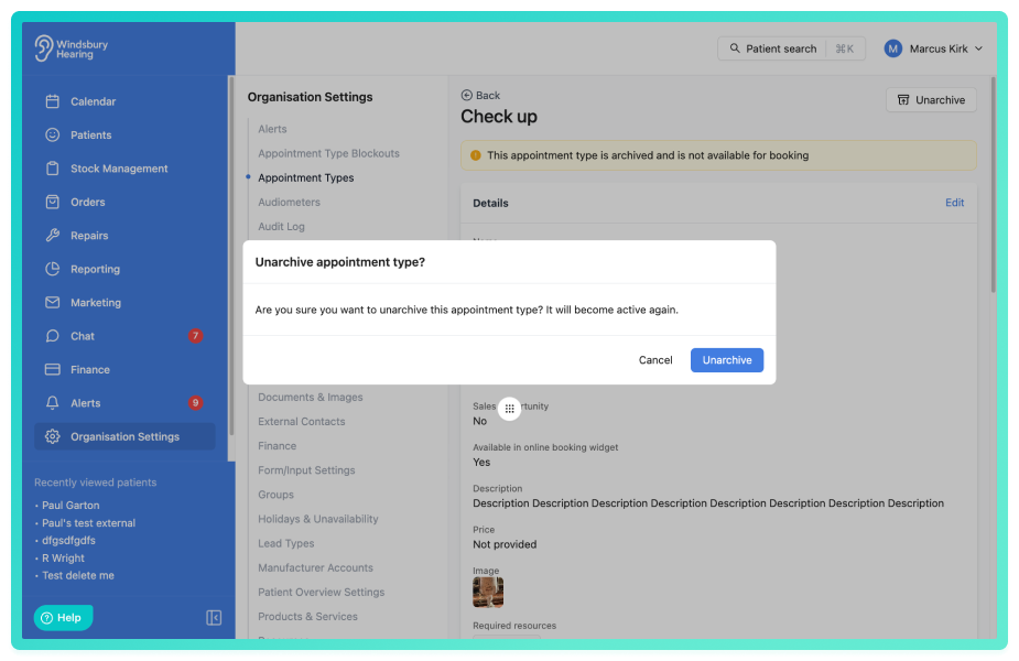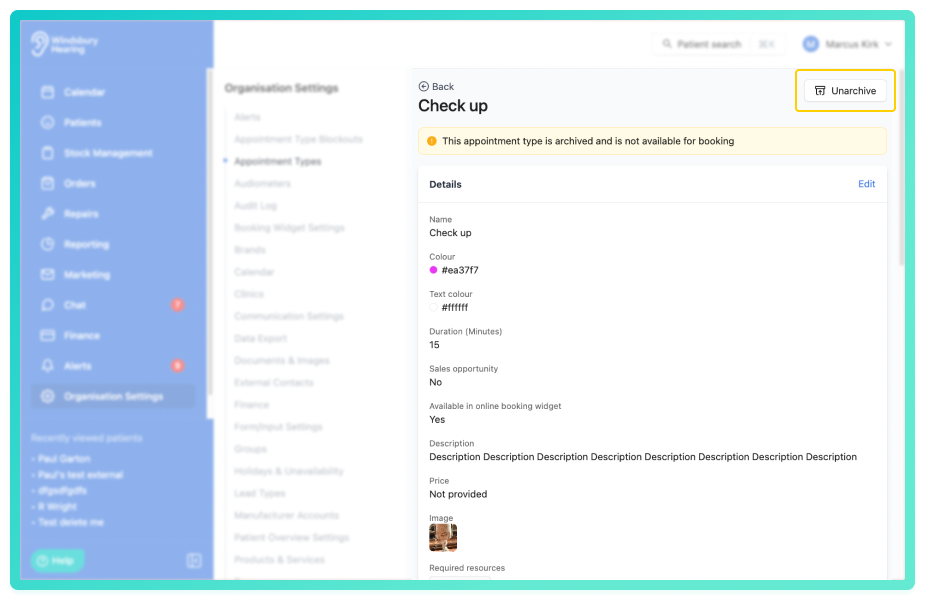 Archived appointment types remain stored in HearLink and can be restored if required. Unarchiving an appointment type will make it available again when booking appointments.
