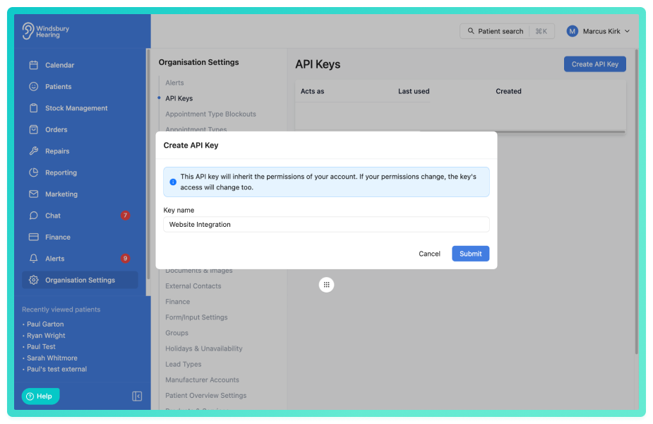 - Enter a Name for the API key (example: Website integration or Reporting tool).