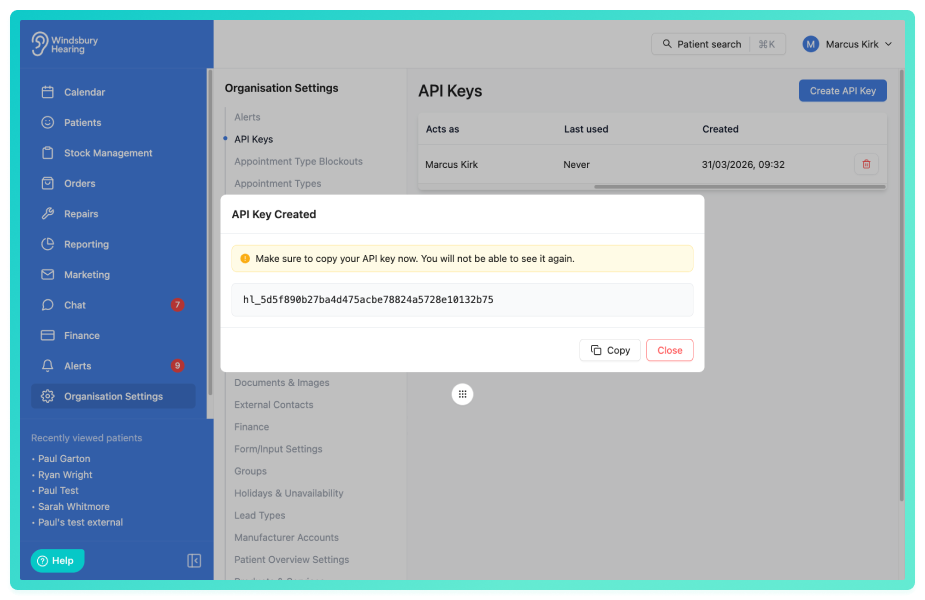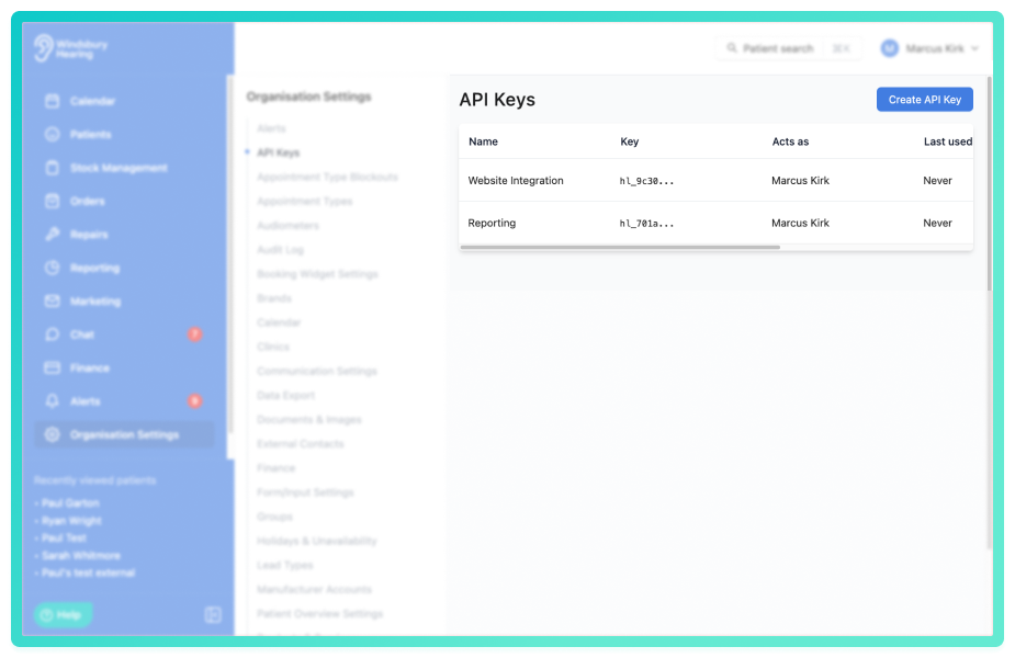 API keys allow external systems to securely connect to your account and access the API. You can create multiple keys to manage integrations.