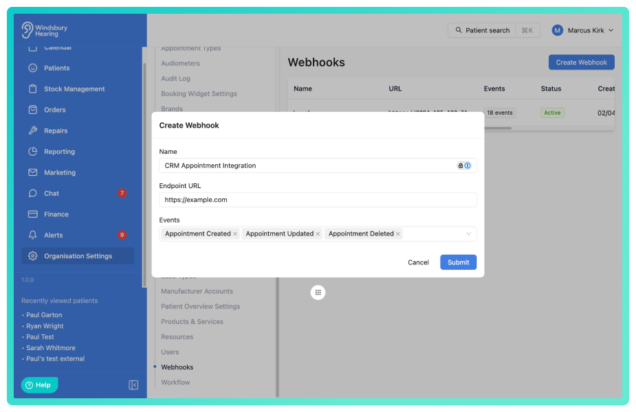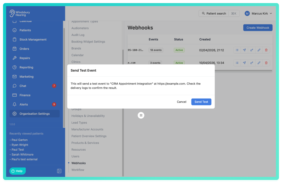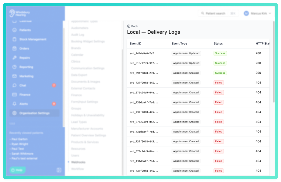 Webhooks allow you to receive automatic notifications when events happen in HearLink. When something changes, such as a new patient being created or an appointment being updated, HearLink sends a message to a URL you specify so your systems can react in real time.