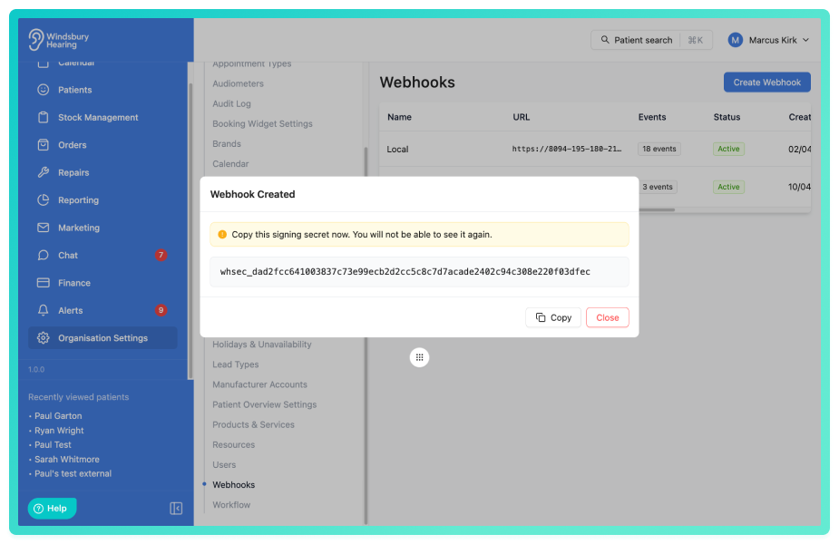 Once created, HearLink generates a signing secret for this webhook. This secret is used to verify that incoming requests to your URL genuinely came from HearLink. Copy and store it securely, it is only shown once.