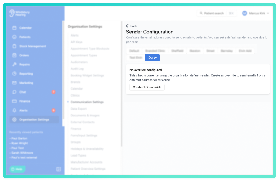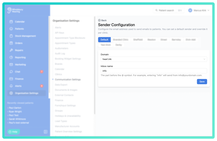 You can also configure different sender details for each clinic, allowing more flexible and branded communication across your organisation.