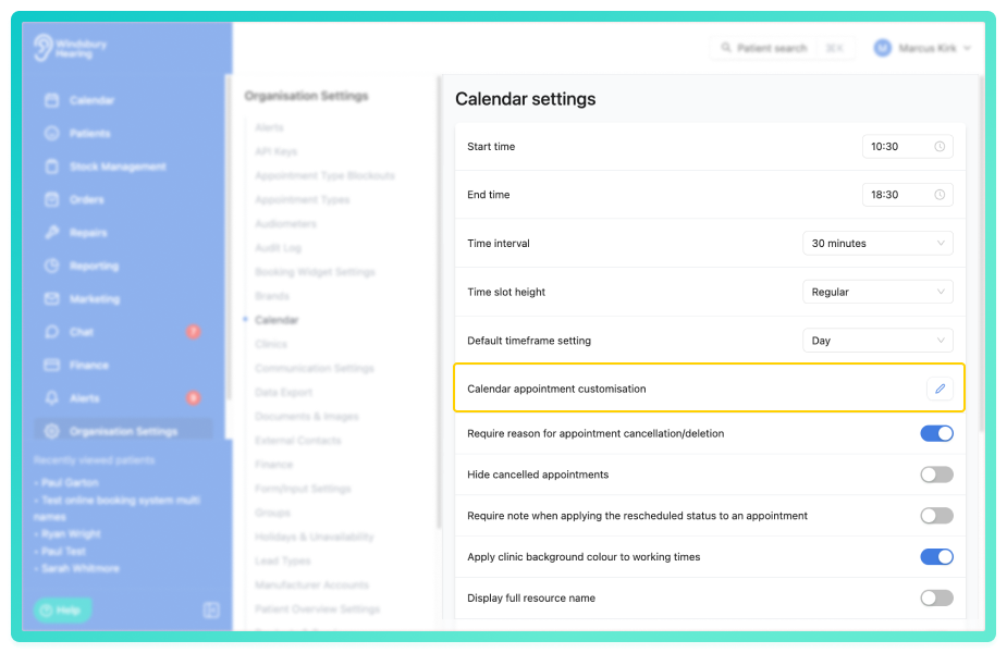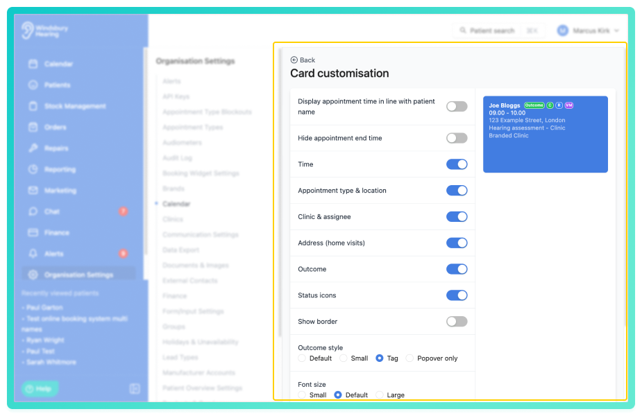 You can customise how appointment cards appear on the calendar to suit your clinic's preferences. The card customisation page provides a live preview that updates immediately as you adjust settings, allowing you to control field visibility, borders, font size, padding and popover behaviour.